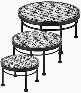 These colorful low plant stands are made with weighted ceramic tops and sturdy metal tubular legs.